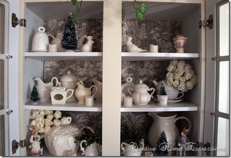 My whites cabinet gets a few green bottlebrush trees and a little greenery. It’s too cramped in here to do much else!