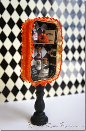 Once the tin seemed good to go, I used E6000 to glue it to a small wooden craft candlestick that I painted black. It is stocked with the bottles, books and a couple of tiny pumpkins I recently ordered from Alpha Stamps. For now I have everything just placed inside and not glued down.